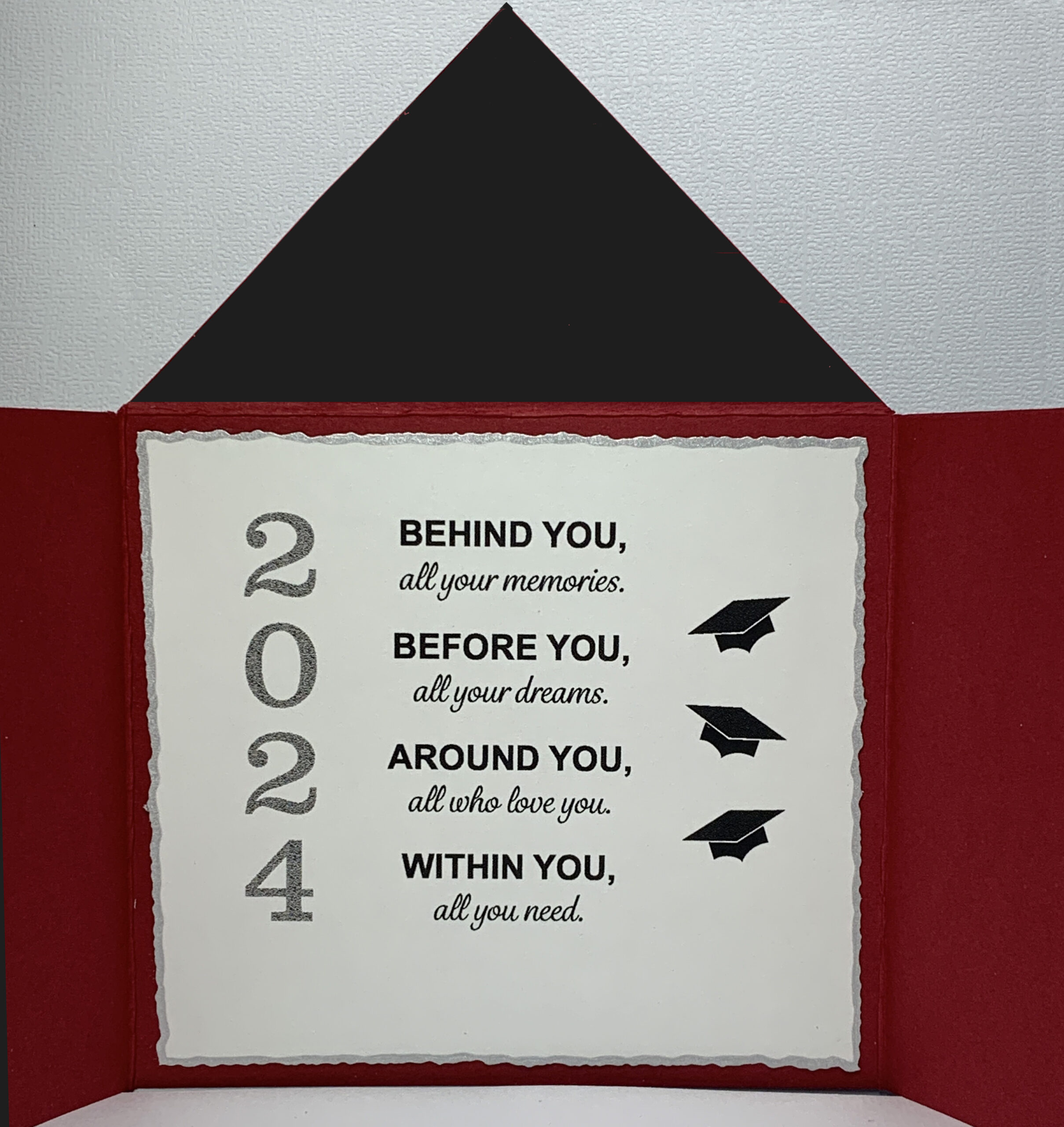 A unique graduation card for a special person. Inside sentiment says, “Behind you, all your memories. Before you, all your dreams. Around you, all who love you. Within you, all you need.”
